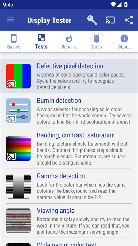 全面的屏幕测试: 包括坏点测试、颜色测试、发光测试等多种测试方法。