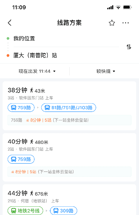 3、动态换乘:去哪儿?结合公交动态信息、首末班发车信息及路径距离等多维度的精准换乘方案;