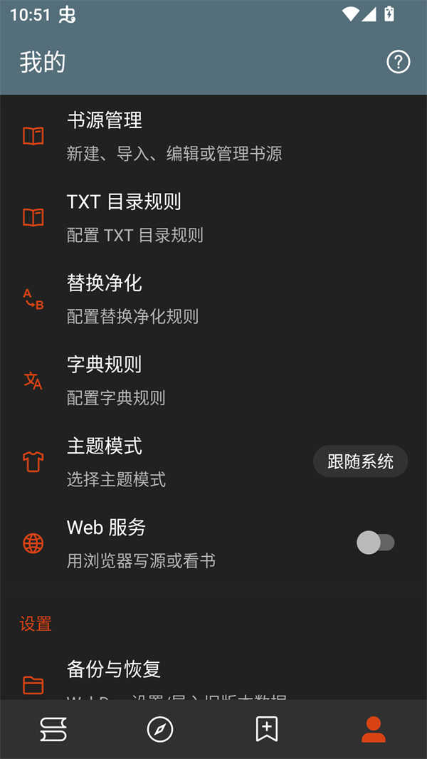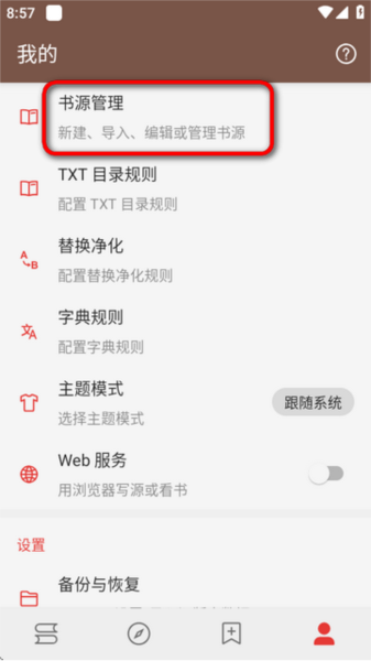 2、接下来我们可以点击右下角的“我的”,然后进入到设置中心,从而进行书源管理、TXT目录规则、替换净化灯操作。