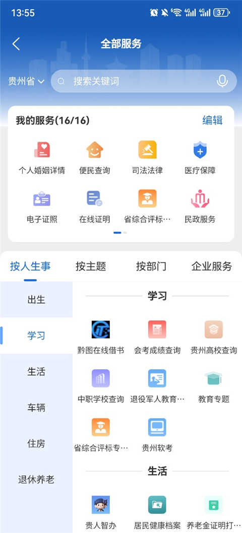 第二步:“按人生事”在“学习”栏选择“退役军人教育培训”服务;