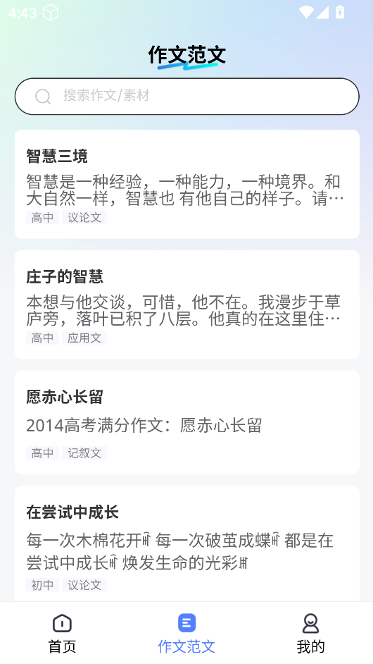 3、允许用户查阅海量作文范文,精选优质写作素材供随心预览,帮助用户汲取写作经验。