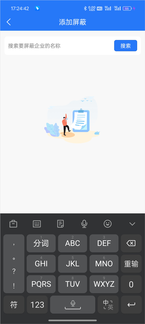 4、点击【添加屏蔽】按钮,输入你想屏蔽的企业名称进行搜索。