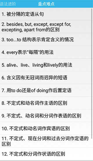 英语语法grammar是一款学习英语语法的绝佳工具,为用户们提供了英语语言的所有语法,以分类的形式呈现,可以让用户快速记住每一个知识点,是你学习英语的最佳学习工具。软件中有着丰富的语法知识,完整的语法图谱,可以很好的帮助大家学习,并且这里还有着英语教学配合题库练习,无论是用于复习还是巩固都可以,还提供拍照纠错、详细解释语法错误、明确解释词汇和语法的功能,方便用户快速找到所需内容。