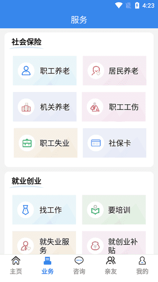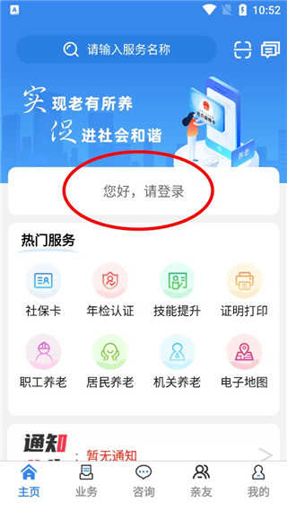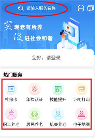 1、首页打开热门服务包括社保卡、证明打印、职工养老、机关养老等;