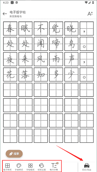 3、可生成打印版字帖,真正的用纸笔来练字。支持A4尺寸纸张。导出字帖后可用手机连接打印机或将字帖发送到电脑用打印机打印。