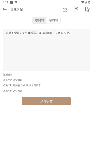 6、不知道练什么内容?App内置三百首古诗,常用汉字3000字,可轻松为您生成一篇字帖。