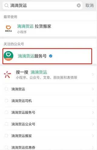 1、在微信搜索框中输入“滴滴货运”,点击搜索结果中的“滴滴货运服务号”;
