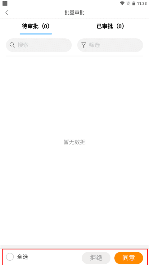 3、你可以采用搜索框和筛选功能找到你要同意审批的考勤申请表,全部选中之后点击同意即可快速审批完成。