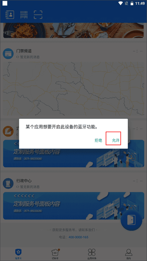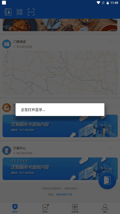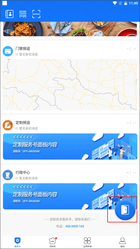 1、点击【服务号】中右下方的门图标,进入到设备绑定界面;