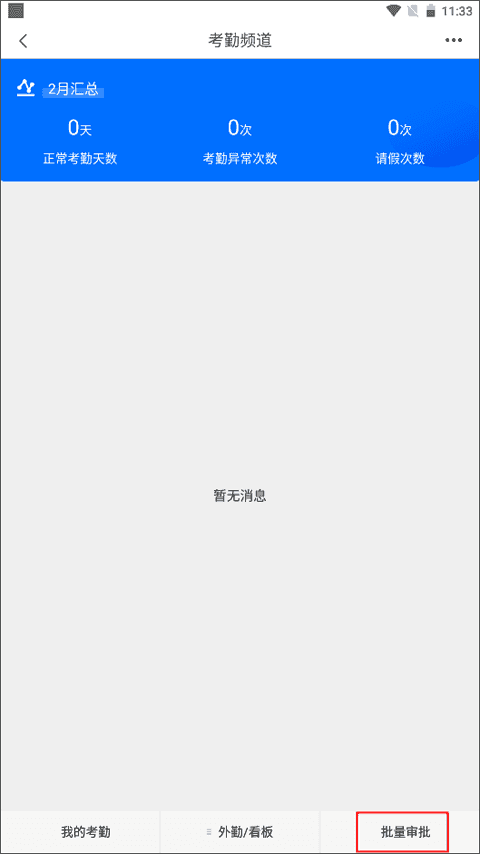 2、在这里,你会看到不同月份的考勤状况,如考勤天数、请假次数等,点击右下角的“批量审批”按钮;
