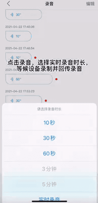 2、点击开始录音,选择实时录音时长,等候设备录制并回传录音,手机就会自动保存对应的录音文件,点击录音文件就可以对远近录音进行相应的编辑操作。