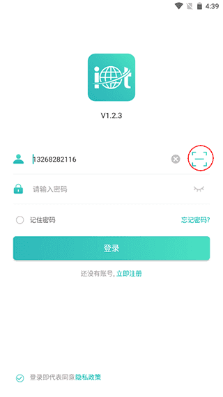 1、打开远近在线App之后点击账户右侧的二维码扫描框图标对设备条码进行扫描。