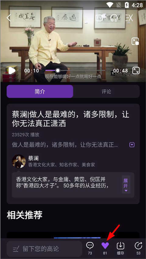 2、在视频播放页面,用户可看到视频的主题、播放次数、评论等信息,点击右下角心心标志即可收藏。