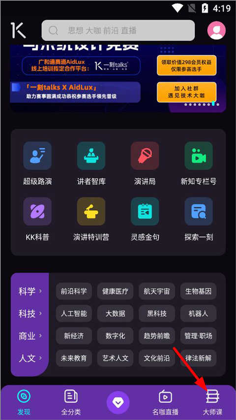 1、打开一刻Talks app,登录进入首页,用户可在发现页面查看超级路演、讲者智库、演讲局、KK科普等栏目,点击大师课;