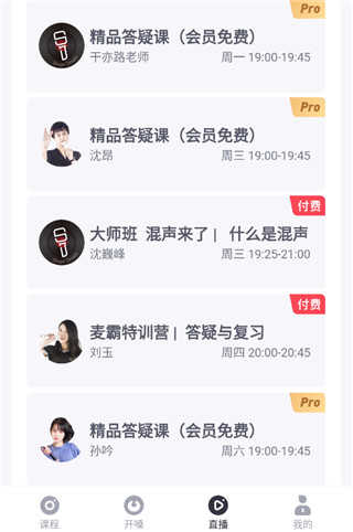 1、打开在本站下载的歌者盟学唱歌免会员版,打开软件,进入首页,我们可以看到有非常丰富的功能,如课程,开嗓、直播等等;