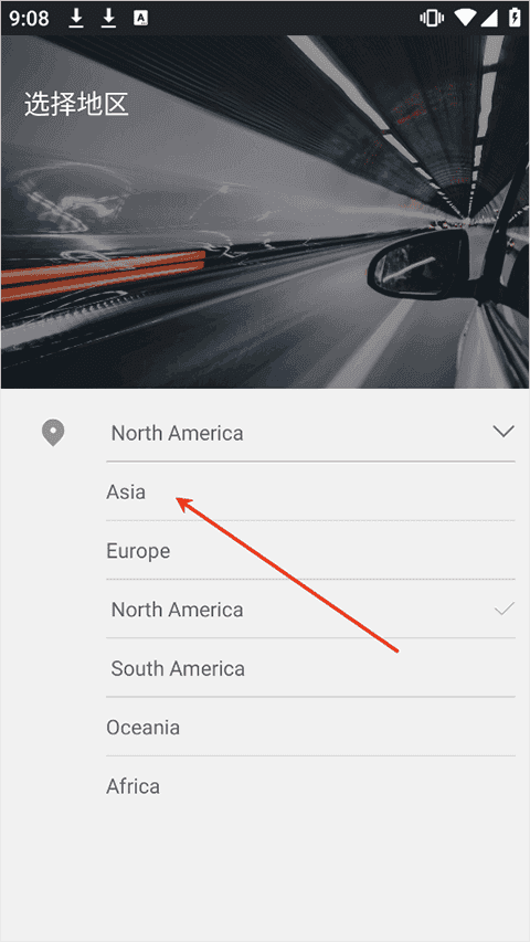 1、在手机上安装好软件后,即可打开进行软件界面,由于是国际版本,首先用户设置下地区,这里点击下图红色箭头所指处。