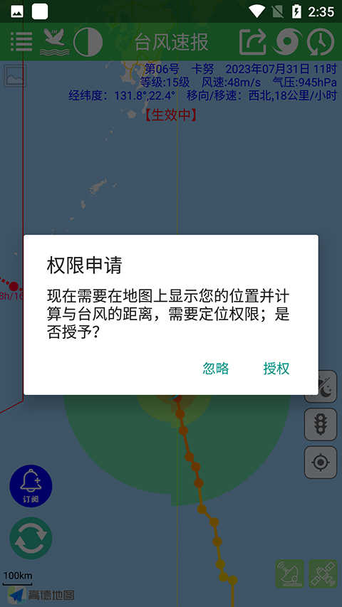 1、当我们想查看台风的风力时,可以点击授予软件相关权限;
