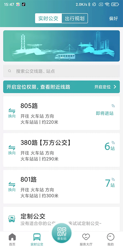 2、开启定位权限查看附近线路,或在搜索栏搜索公交线路、站点;