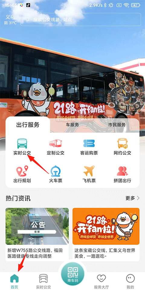 1、打开义乌行APP,点击首页-实时公交;