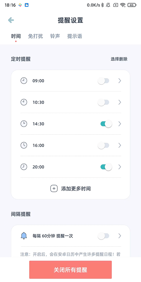 2、关闭下方开启的定时提醒,或点击下方【关闭所有提醒】;
