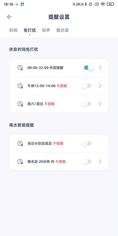 3、点击免打扰,还可以关闭自定义时段的喝水提醒。