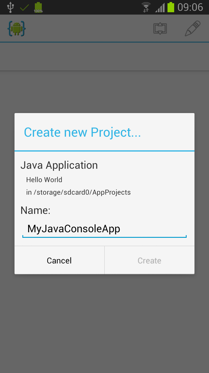 将弹出一个对话框,您可以在其中定义新应用程序的名称。最后,点击 “创建” 让 AIDE 生成您的新项目。