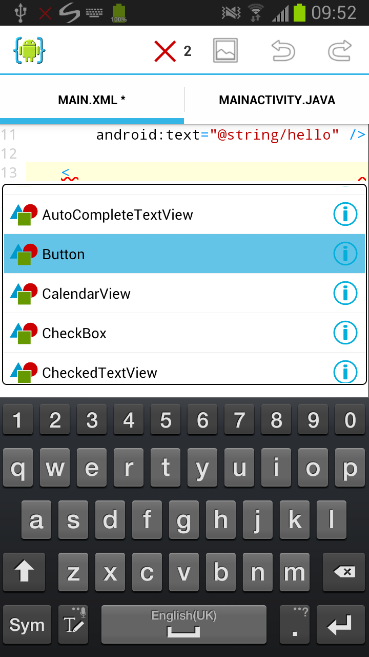 Android 应用程序的图形用户界面是使用 View 层次结构构建的。Android SDK 提供了一种 XML 文件格式,允许您使用 XML 中的 UI 元素的层次结构。当您创建“Hello World 应用程序”时,AIDE 会自动打开 main.xml 文件,用于定义此应用的主 Activity 界面。AIDE 有一个内置的设计器,可以向您展示这个 XML 定义的布局在运行时会是什么样子。