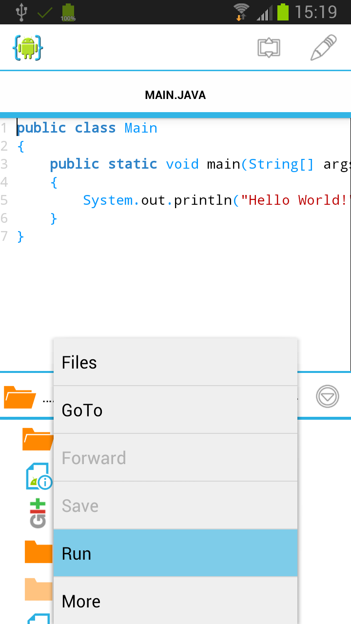 应用程序项目包含构成其源代码的所有文件。AIDE 将在您的 SD 卡上生成这些文件。AIDE 也会打开 main 类: Main.java。默认情况下,AIDE 将为您的新项目创建一个 Git 存储库。可以在设置中关闭此行为。