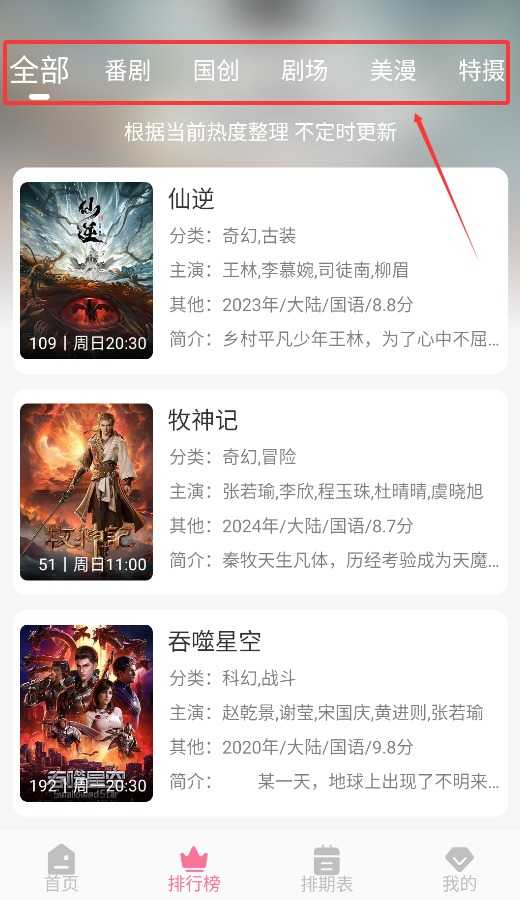 3、排行榜单支持按全部作品、番剧、国创等类别查看各分类热度排序。