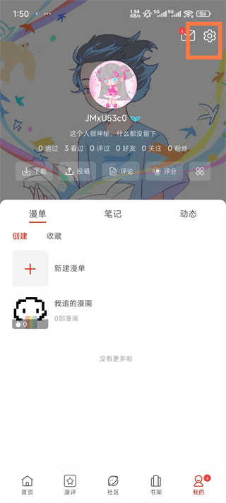 5、如果觉得漫画不够看或者卡顿可以点击【我的】在点击【齿轮】