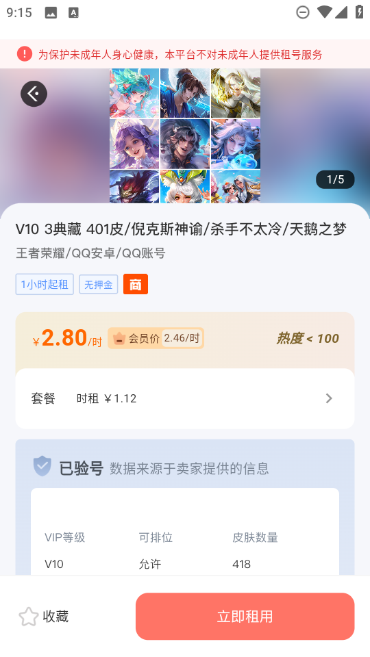 V租号一个非常好用的游戏租号平台,里面有大量的精品账号,众多玩家在这里出租自己的账号,大部分拥有极品装备、限定皮肤等,该软件1元可租,覆盖品类账号端游、手游等高级账号,让你方便体验高玩乐趣。租用界面有详细的账号描述,轻松满足不同玩家的使用需求。需要注意的是为保护未成年人身心健康,本平台不对未成年人提供租号服务。