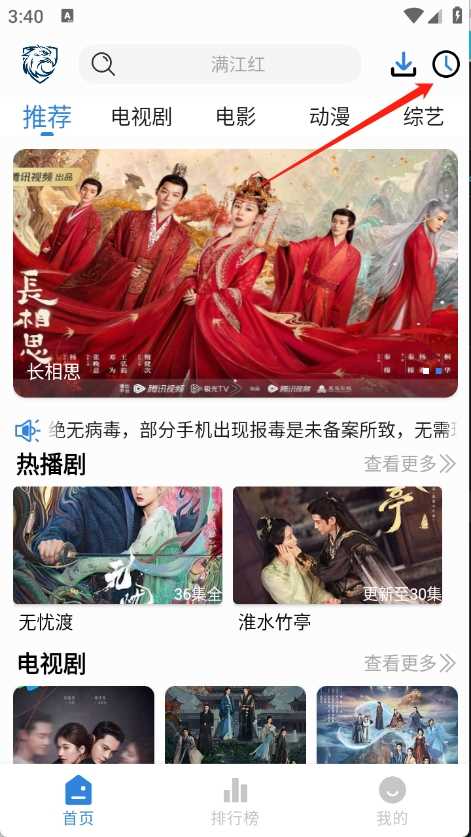 1、进入到首页之后点击右上角的观看历史。