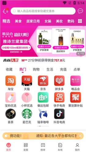2、进入软件首页后,我们可以看到时下最热门的电商平台,只要用户任意点击一个平台并按照要求即可购买商品或赚取佣金;
