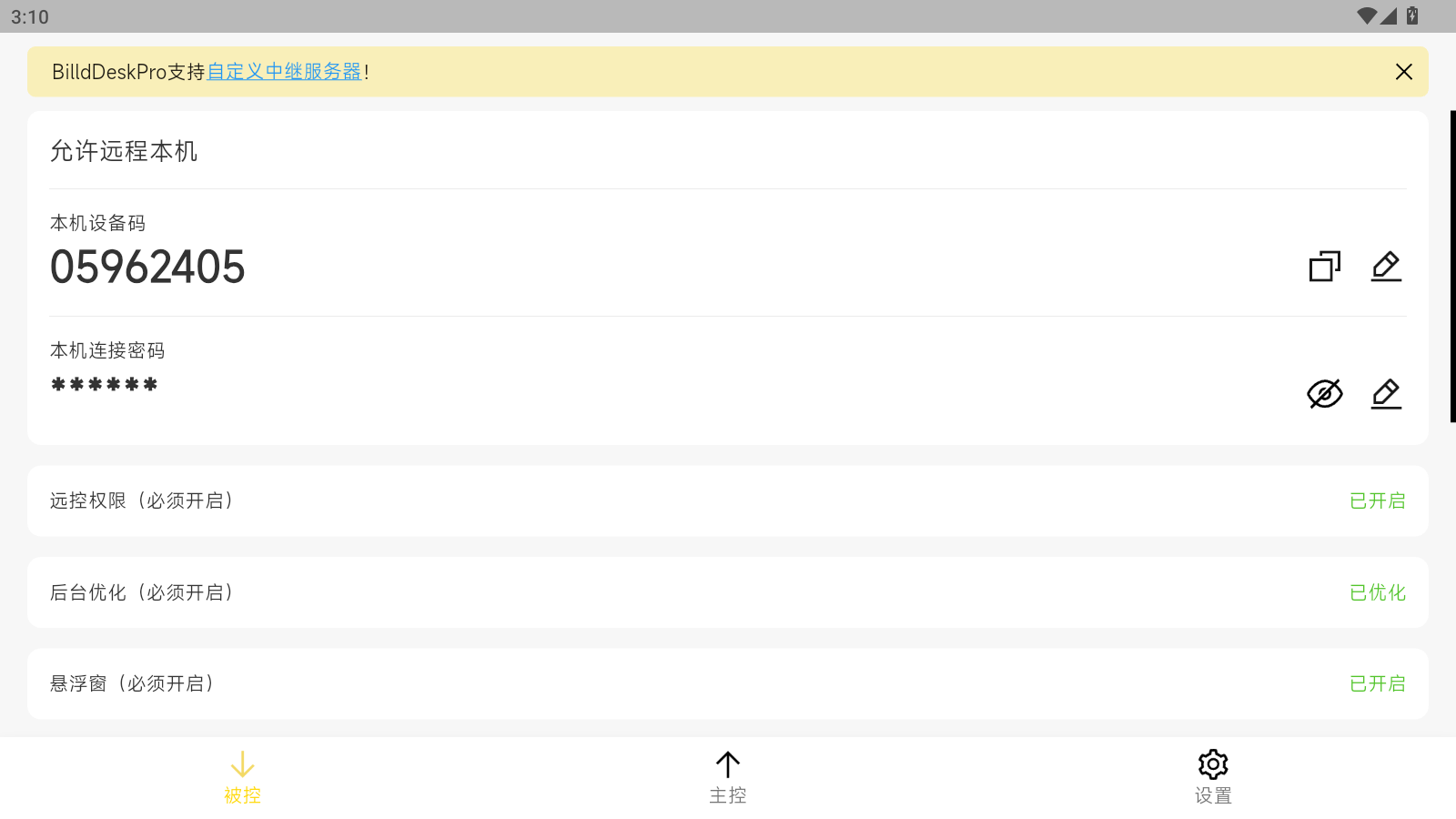 2、进入被控界面,开启被控端所需要的权限,即可与主控端连接。