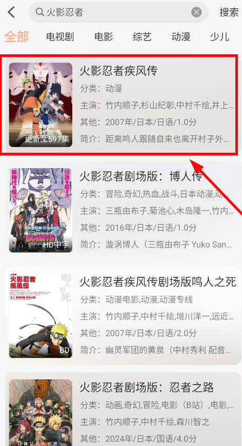 4、这里小编以“火影忍者”为例,点击搜索之后,界面上会出现相对应的搜索结果。