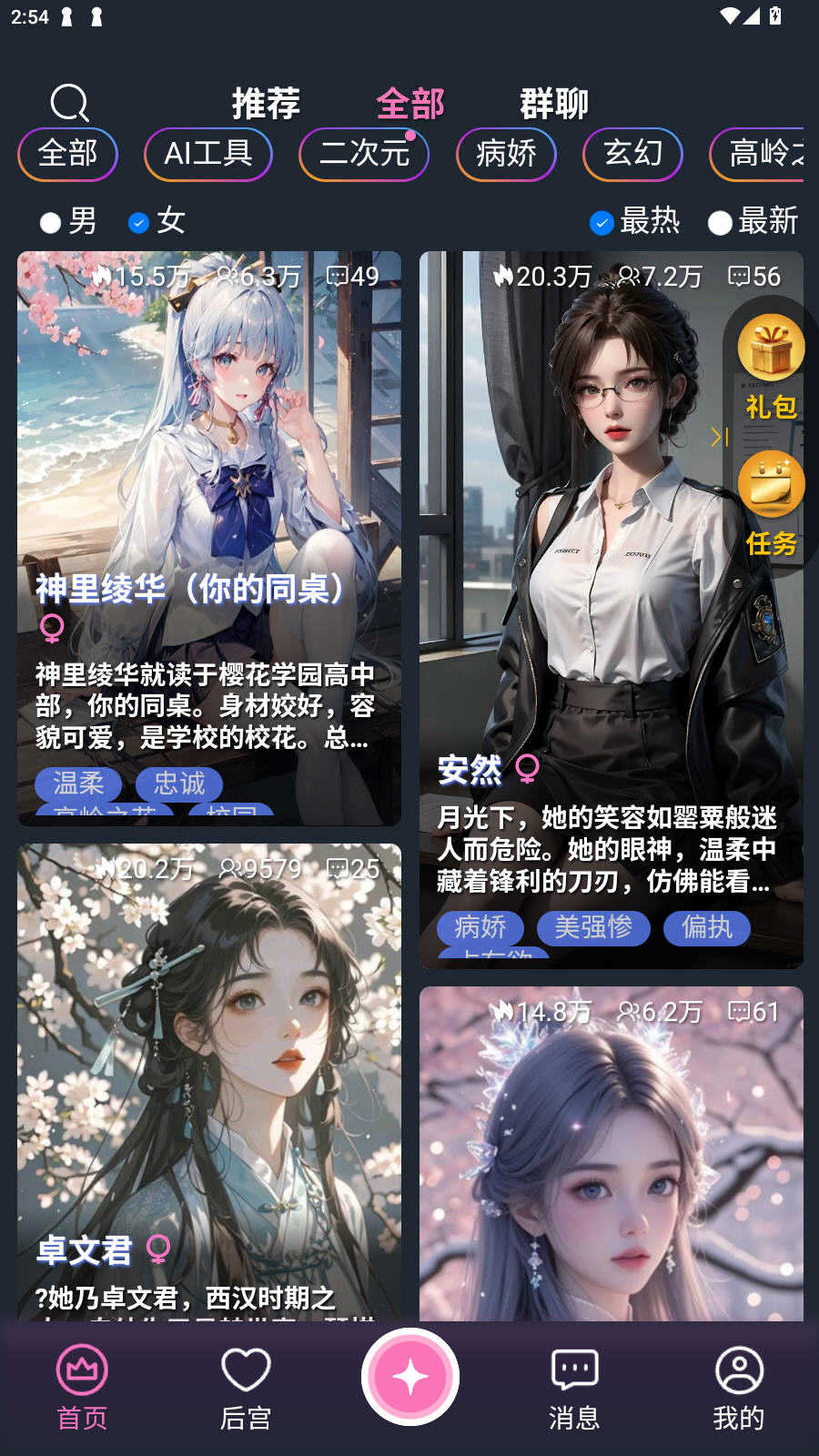 1、打开幽光ai伴侣app,进入推荐,可以查看推荐角色