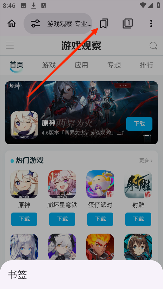 4、点击右上角的箭头所指的图标,还可以添加书签哦,如下图所示。