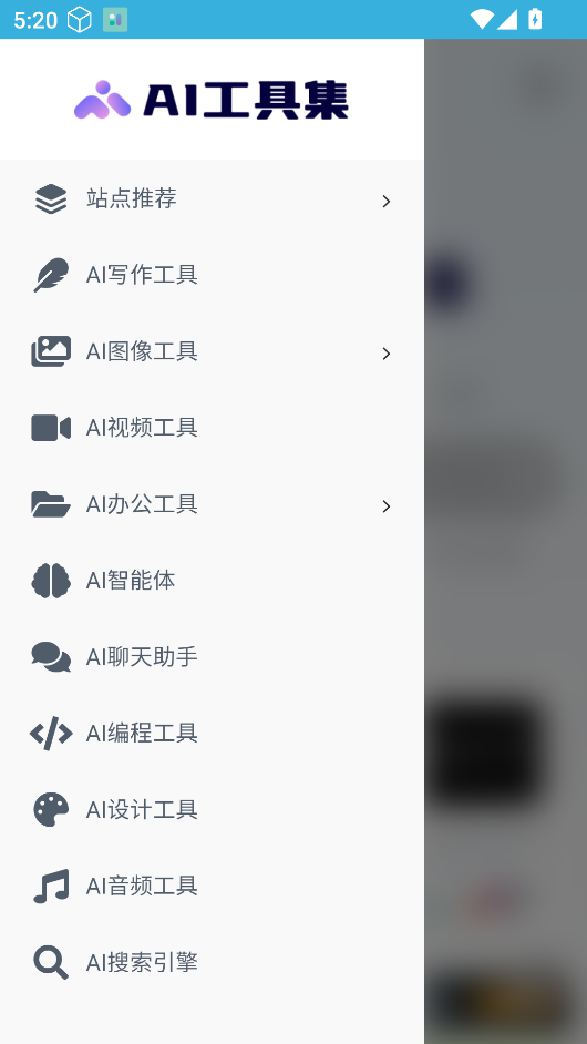 3、点击主页右上方三条线可看到ai工具分类,可选择需要的类型使用。