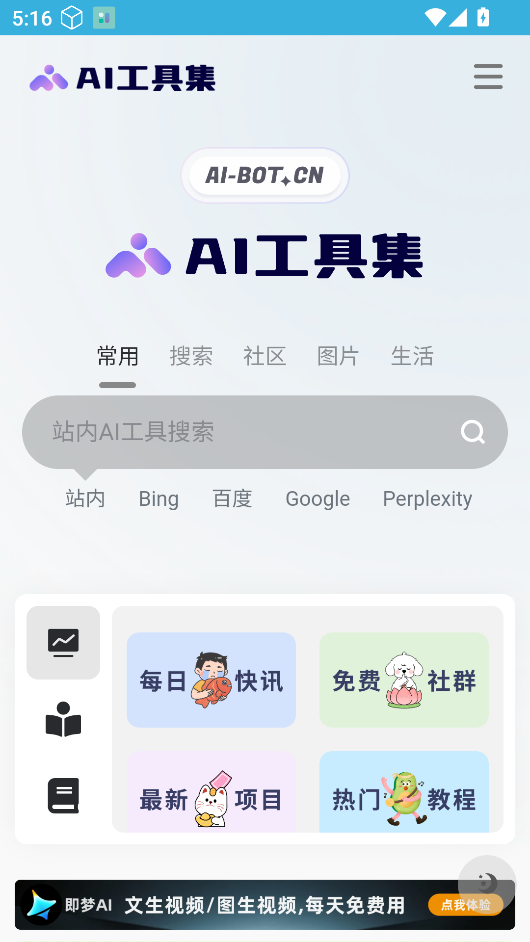 AI工具集是一款汇集了AI资源的软件,是AI资源一站式入口,软件内整合了AI绘画、写作、编程、视频制作、办公、设计等实用工具,AI工具比较齐全,让用户无需单独下载多个AI软件,在软件内点击即可使用。所有功能免费开放,即点即用,覆盖创作、办公、开发等全场景需求,助力用户高效完成各类数字创作与工作任务。软件中拥有自动跳转的功能,功能全面,界面清晰,操作便捷,适用于生活中的多个场景。