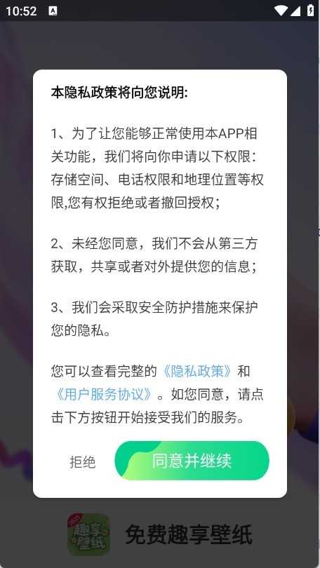 1、用户首先在本站下载安装免费趣享壁纸后,打开软件、查看并同意隐私政策与用户协议。
