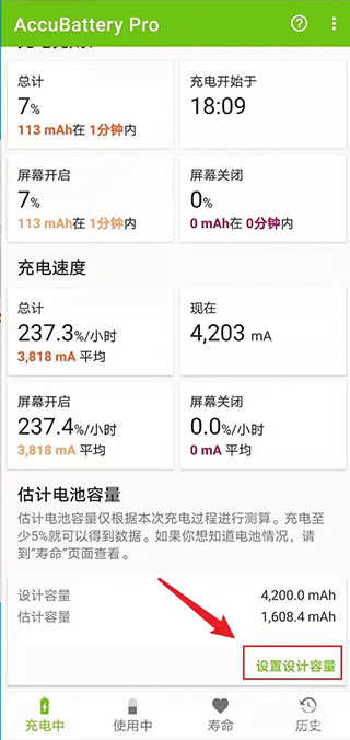 2、进入页面后在充电页面点击右侧下方的设置设计容量;