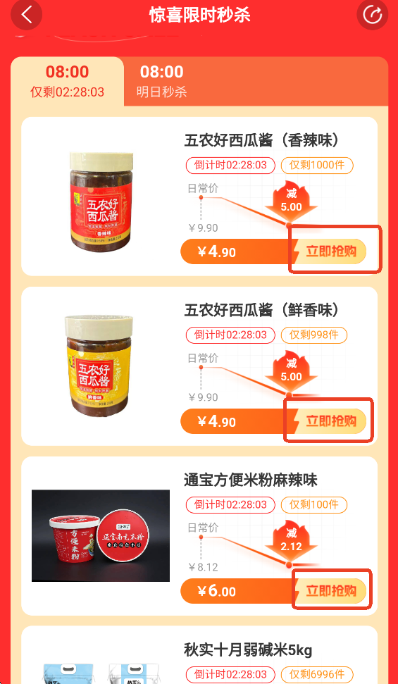 2、进去我们可以看到今天和明天的秒杀开始时间和商品。