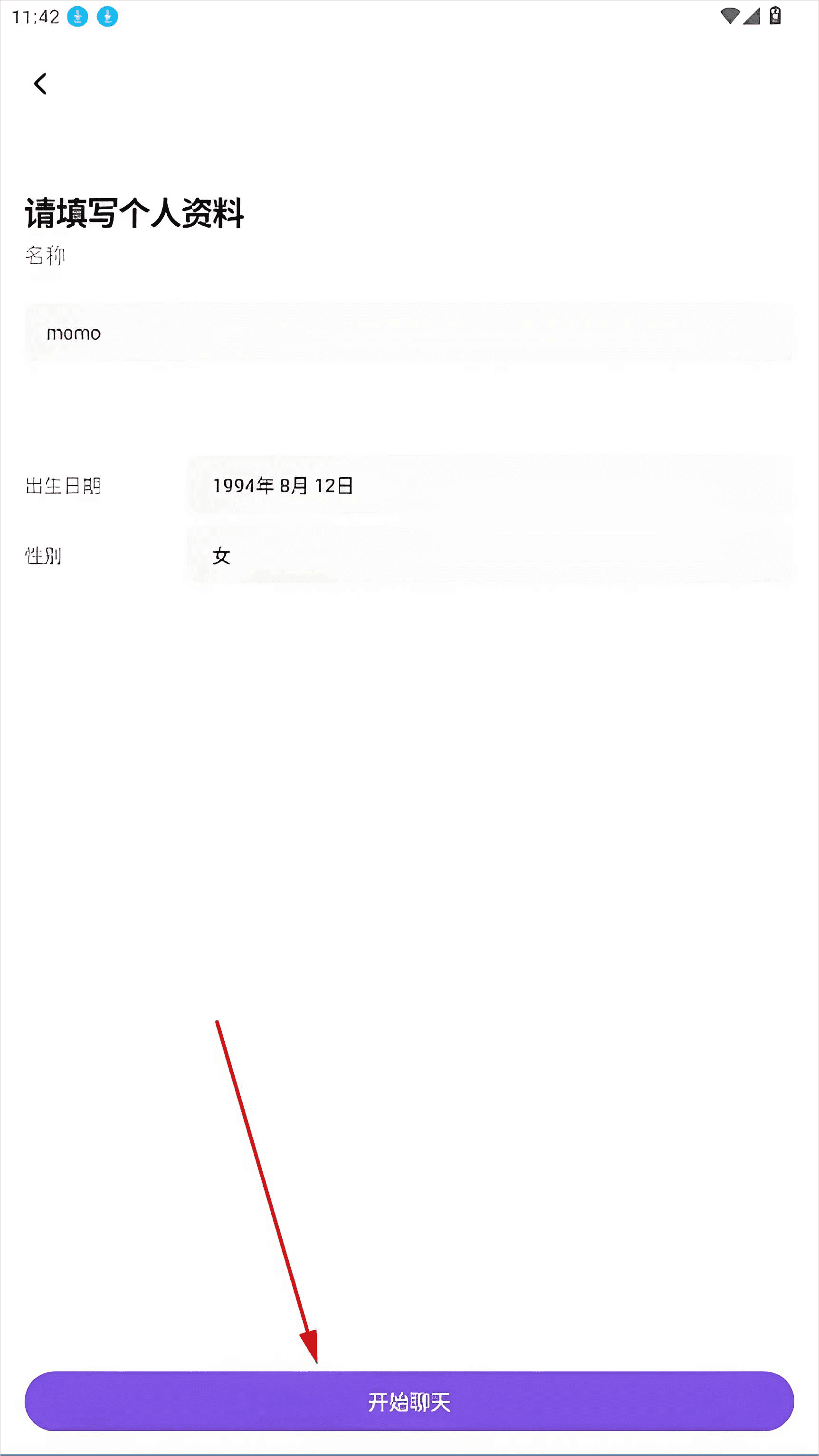 1、注册登录之后,请填写你的个人资料,点击底部的开始聊天。