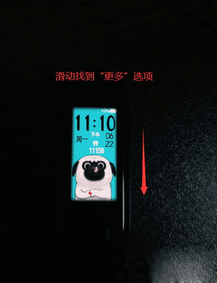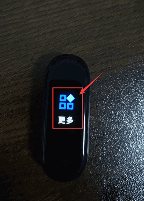 1、第一步,点亮小米手环,上下滑动,找到更多菜单。