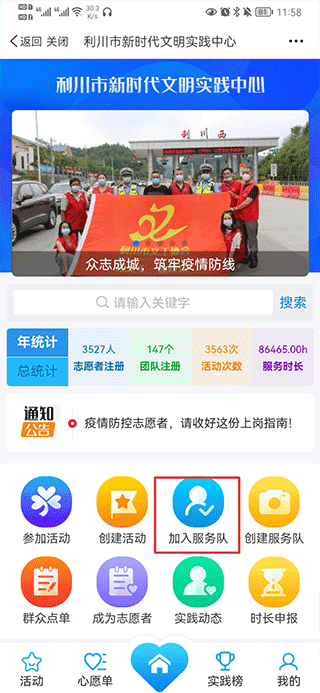 四、待审核通过后,返回到文明实践中,点击加入服务队