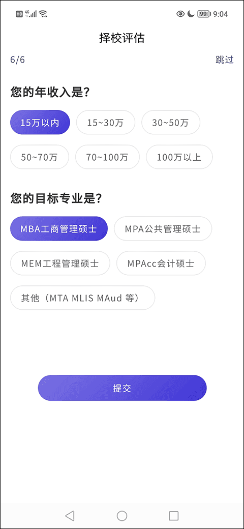 7、在择校评估第六栏选择好自己的年收入、目标专业后点击提交即可。