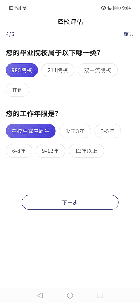5、在择校评估第四栏选择好毕业院校类型、工作年限后找到并点击“下一步”选项;