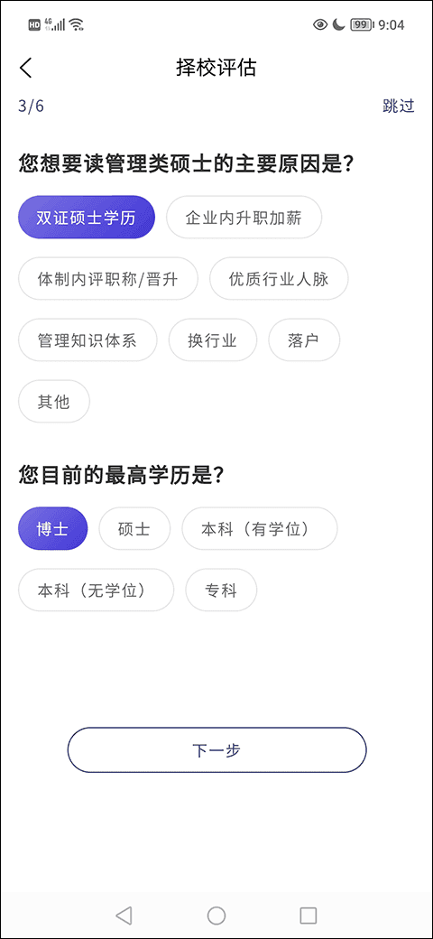 4、接着,在择校评估第三栏选好学习的主要原因、自己的最高学历后找到并点击“下一步”选项;