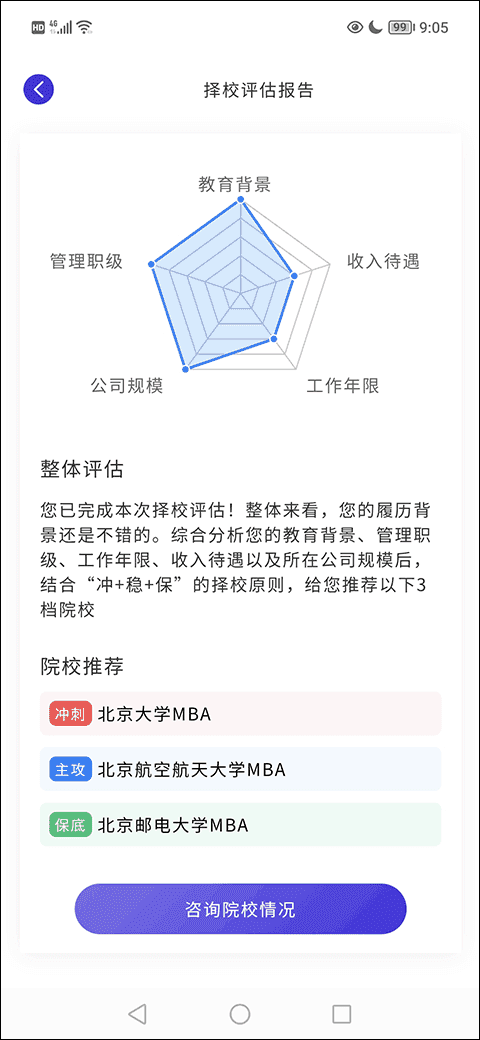 1、首先,打开软件,在MBA一栏找到并点击“择校评估”选项;