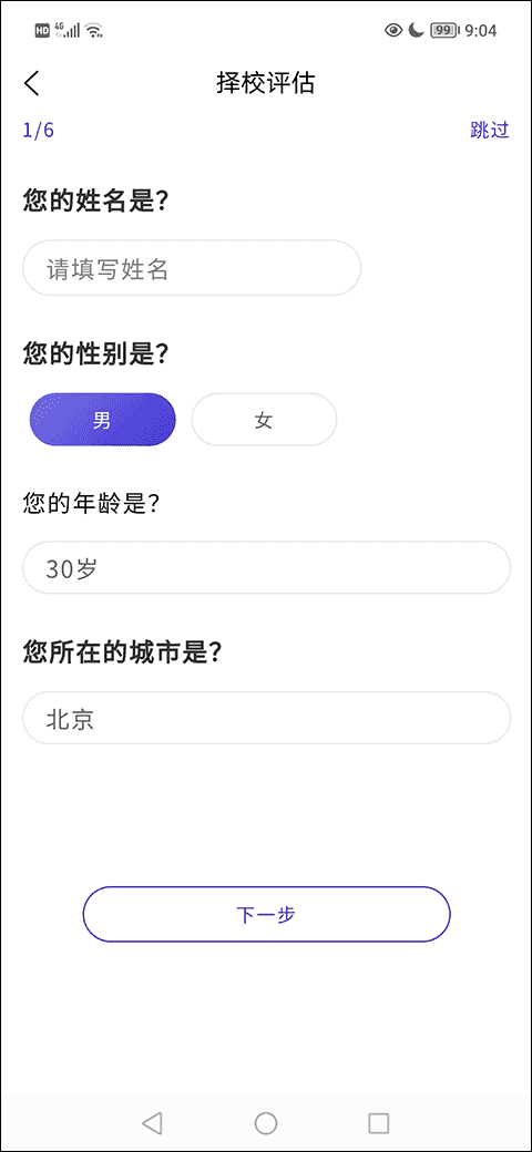 2、然后,在择校评估第一栏填好姓名、性别、年龄和城市后点击下一步;